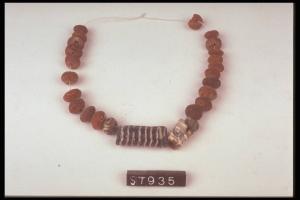 Collana composta da 21 elementi di ambra e 2 di pasta vitrea di forma lenticolare