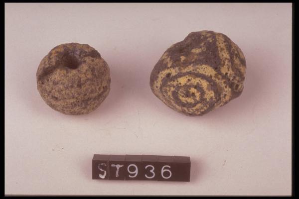 Due grandi perle di pasta vitrea nere con zone circolari concentriche gialle