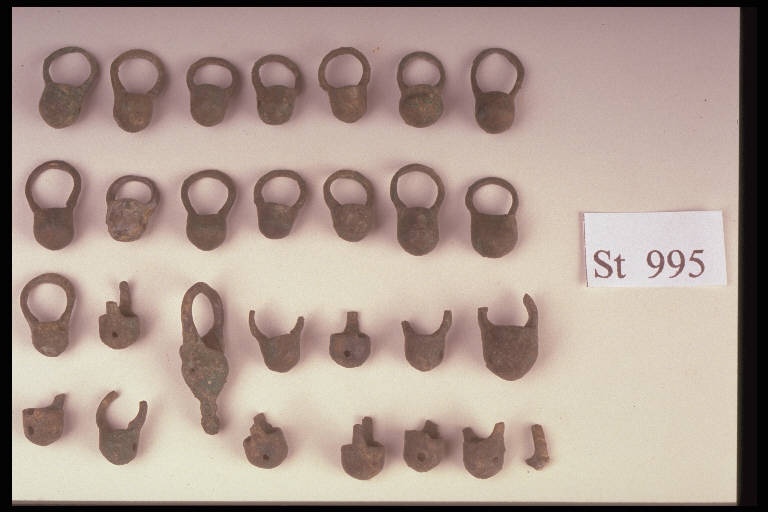 27 pendagli a secchiello di grandezza non uniforme, tondeggianti, con fori passanti. Uno è restaurato verso il basso e termina con un'espansione a globetto.