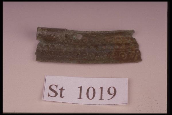 Frammento di tesa di elmo decorato da una fila di puntini a sbalzo compresi fra due file di occhi di dado