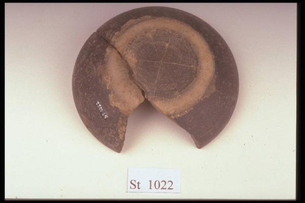 Ciotola a forma di calotta con orlo lievemente rientrante. Sul fondo esterno è graffito un asterisco. Vernice nera lucida su tutta la superficie