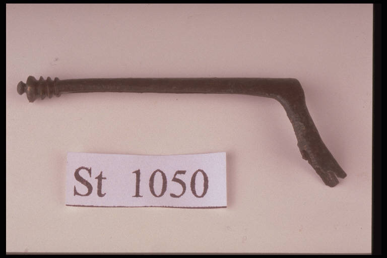Lunga staffa terminante con quattro dischetti e piccola appendice troncoconica, pertinente a fibula a navicella.