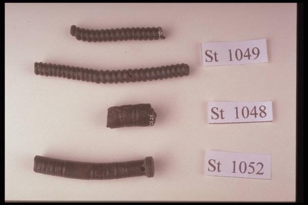 Elemento cilindrico cavo internamente con un'estremità ingrossata, decorato da fasci di linee parallele incise