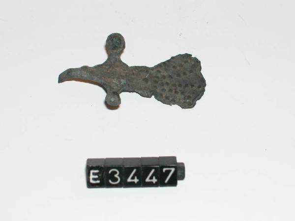 Attacco di ansa a forma di croce, con parte inferiore costituita da una piastrina trapezoidale decorata da file di puntini a sbalzo e due appendici a bottoncino ai lati