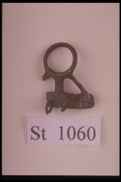 Fibula a grandi coste con agglomerato di ferro e bronzo tra cui si riconoscono frammenti di catenelle, di collana e di una fibula a navicella
