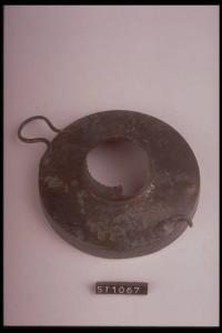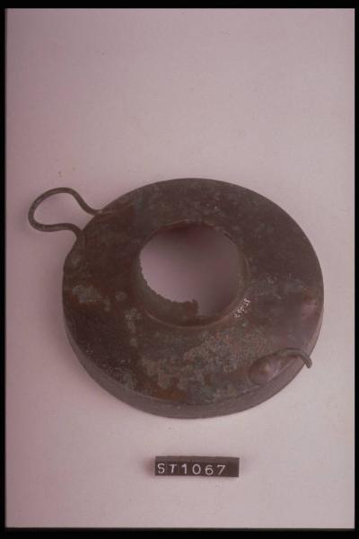 Colino di lamina con due anse ad occhiello fissate al corpo da piastrine a orecchietta.