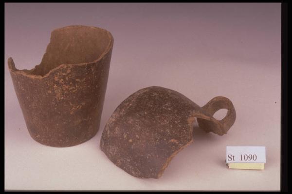 Boccale a corpo subcilindrico con ansa verticale a nastro. Superficie di colore nerastro, arancio e nero in frattura.