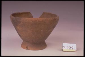 Coppa a corpo troncoconico, orlo leggermente rientrante, basso piede obliquo. Superficie di colore nerastro e bruno non omogeneo.
