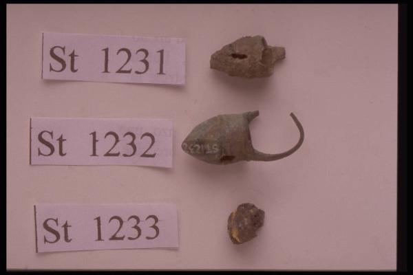 Pendaglio a secchiello con fondo a punta e due fori passanti lungo il corpo.