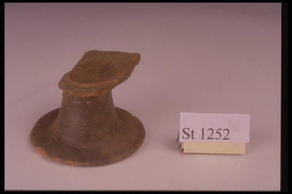 Piede e fondo di coppa decorata internamente a stralucido a raggiera. Superficie verniciata di nero graffitifero; colore in frattura grigiastro con sottili bordi arancioni.