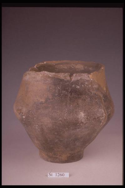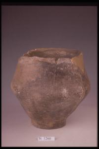 Urna biconica con piede leggermente svasato. Conserva una bugnetta in corrispondenza del diametro massimo. Colore non omogeneo grigiastro