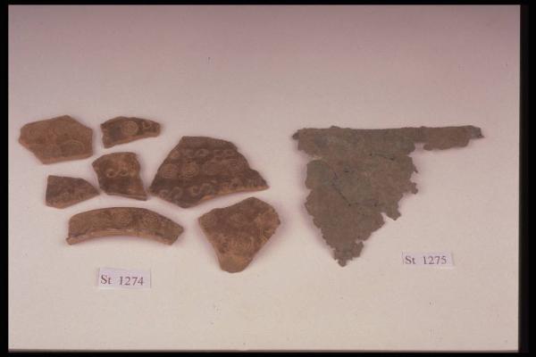Frammenti di vaso con spalla appena pronunciata e piccolo orlo ingrossato, decorato da fasce alternate di cerchietti concentrici e S rovesciate incise. Colore nerastro con chiazze brune.