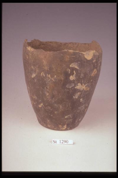 Vaso a corpo troncoconico, pareti a profilo convesso. Superficie esterna coperta da vernice graffitifera nera. Colore in frattura grigiastro