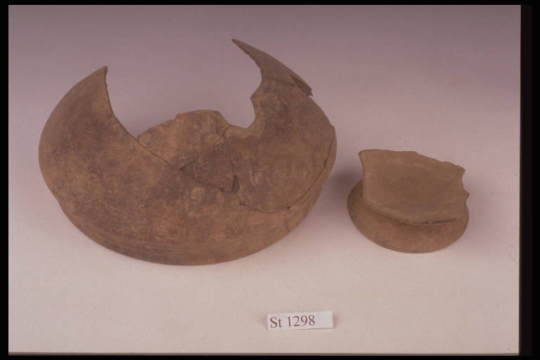 Coppa a corpo troncoconico, orlo rientrante con tre costolature. Frattura grigiastra con piccoli margini nocciola chiaro. Tracce di vernice graffitifera bruna sulla superficie esterna