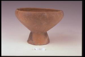 Coppa a corpo troncoconico, orlo rientrante, medio piede obliquo. Colore nocciola con chiazze nerastre.
