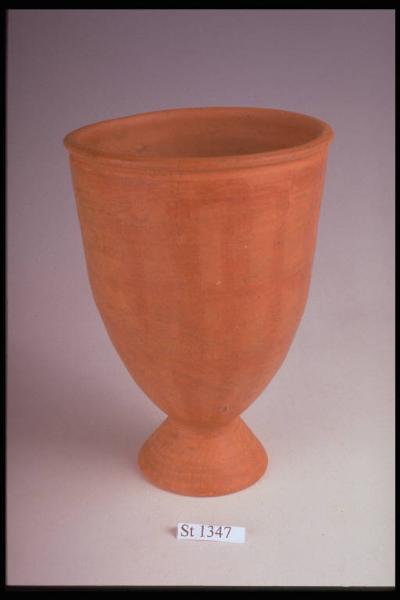 Vaso a tulipano con orlo aggettante a cordoncino, su medio piede troncoconico, decorato a stralucido da 4 fasce orizzontali intersecate da fasce verticali sul corpo; sul piede linee radiali leggermente incurvare. Sezione arancio.