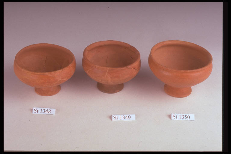 Coppetta su medio piede, piccolo orlo distinto ed esoverso. Decorata a stralucido da una fascia piena sotto l'orlo e da un motivo a reticolo. Sezione arancio.