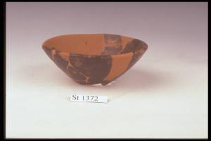 Coppetta a corpo troncoconico, orlo appena arrotondato. Impasto colore nocciola, superficie esterna coperta di vernice nera, all'interno linee nere verticali a stralucido.