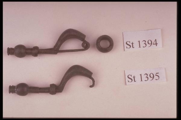 Fibula a sanguisuga con lunga staffa desinente a globetto e appendice prima cilindrica e poi troncoconica. Anello ferma ago sulla staffa, anello a sezione biconvessa infilato sull'ago. Arco decorato da fasci di linee incise.
