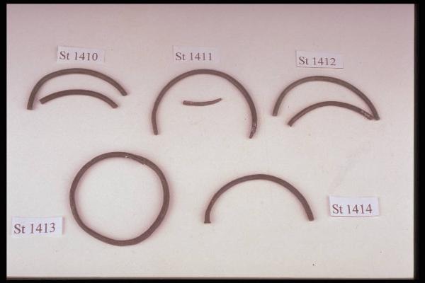 Armilla a capi sovrapposti di verghetta di bronzo a sezione circolare che verso le estremità diventa rettangolare. Le estremità presentano due globetti profilati preceduti da un tratto decorato a fitte linee parallele incise.