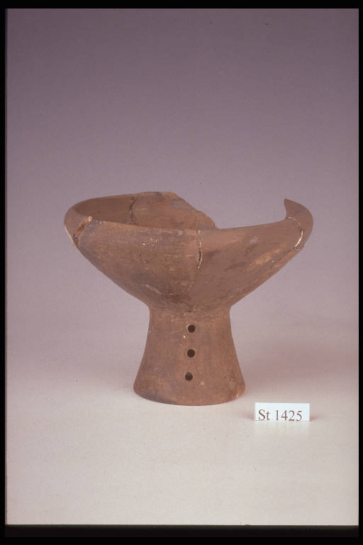 Coppa a corpo troncoconico, orlo rientrante, medio piede troncoconico decorato da tre file di forellni circolari. Colore nocciola scuro.