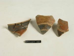 Frammenti di parete di recipiente decorato da una costolatura. Frattura grigio chiaro con ampi margini arancio. Superficie esterna colore arancio con una fascia nera.