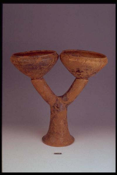 Doppiere costituito da alto piede svasato a tromba cavo internamente insieme a cui sono uniti i due bracci a Y; due coppe a corpo troncoconico, labbro rientrante, orlo distinto a cordoncino. Il fondo di entrambe le coppe presenta un'appendice cilindrica per l'incastro nei bracci. Decorazione a rosette impresse a stampiglia. Colore di superficie non omogeneo, brunastro e nero.