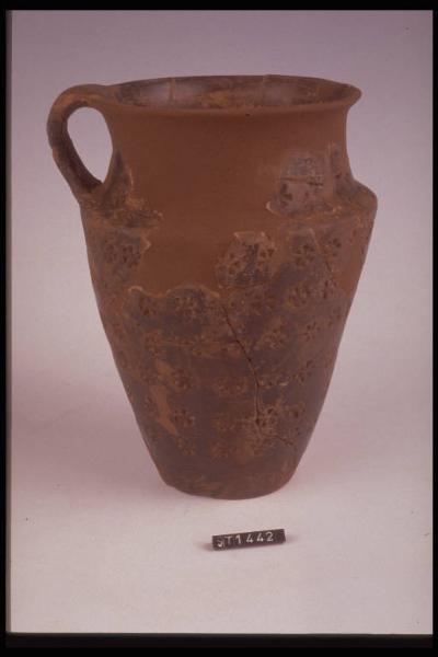 Boccale a corpo troncoconico con ansa a nastro impostata fra orlo e spalla, orlo leggermente esoverso, collo cilindrico, spalla angolosa. Decorazione impressa a rosette. Frattura nocciola, colore di superficie non omogeneo bruno nerastro.