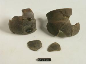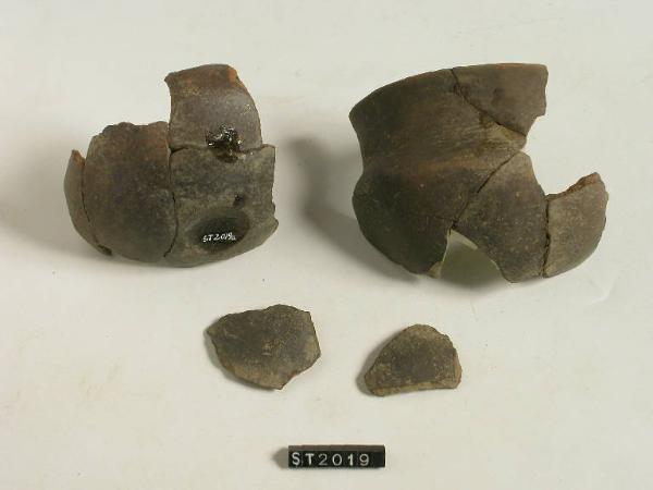Frammenti di recipiente con collo cilindrico e breve spalla arrotondata (forse bicchiere carenato con fondo ombelicato). Colore nerastro.