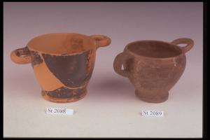 Imitazione di skyphos ad anse inverse; colore brunastro; vernice bruno-nerastra non omogenea