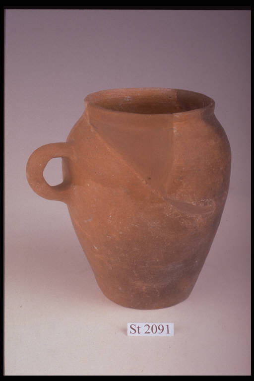 Boccale a corpo ovoide con ansa verticale ad occhiello impostata a 2/3 dell'altezza, breve collo cilindrico. Impasto con inclusi piccoli e medi. Colore non omogeneo bruno-nerastro.