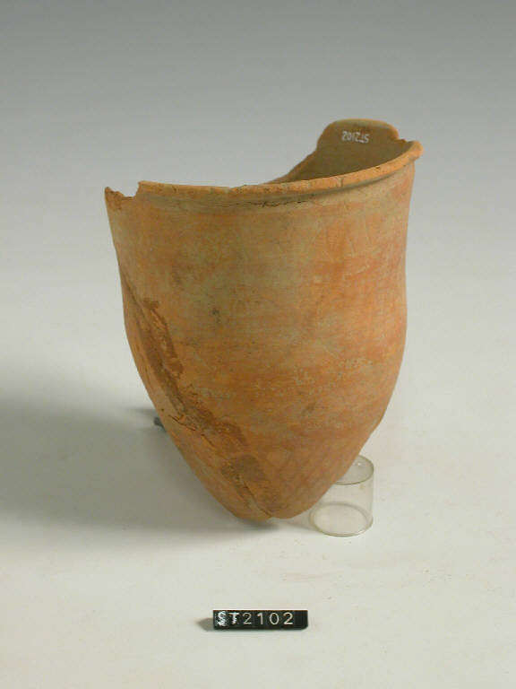 Vaso a tulipano con orlo a cordoncino aggettante spttolineato da una breve gola; decorazione incisa a zig-zag sotto l'orlo; sul corpo due bande comprese tra due fasce a reticolo e stralucido rosso.