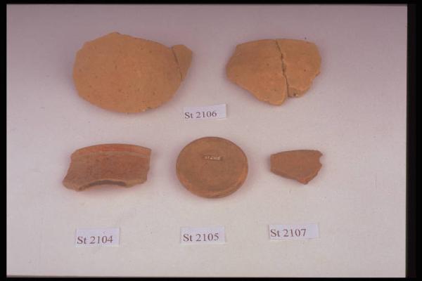 Frammento di orlo probabilmente pertinente ad un vaso a tulipano; orlo appena esoverso. Colore in frattura nerastro con piccoli margini arancio, superficie arancio, decorata da due fasce a zig-zag a stralucido rosso.