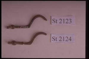 Fibuletta ad arco pieno e sezione biconvessa; lunga staffa terminante a globetto e appendice troncoconica; corpo decorato da fasci di linee parallele alle estremità.