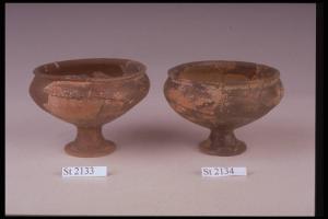 Coppetta a medio piede svasato a tromba, orlo a cordoncino, sottolineato da una piccola gola; decorato a stralucido nero da una banda sotto l'orlo e da un motivo a reticolo. Colore arancio, superficie nerastra lucida.