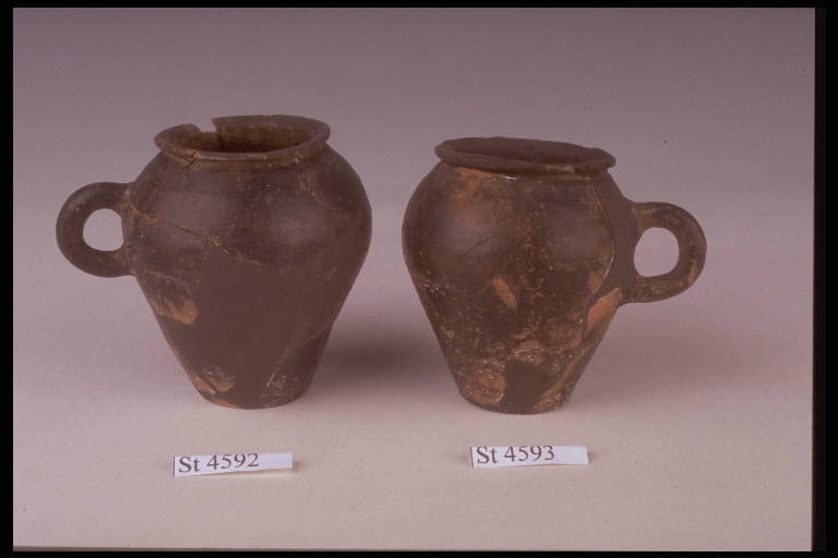 Boccale a corpo ovoide con ansa verticale ad occhiello, piccolo orlo esoverso, fondo piano. Colore bruno-arancio, superficie nera lucida.