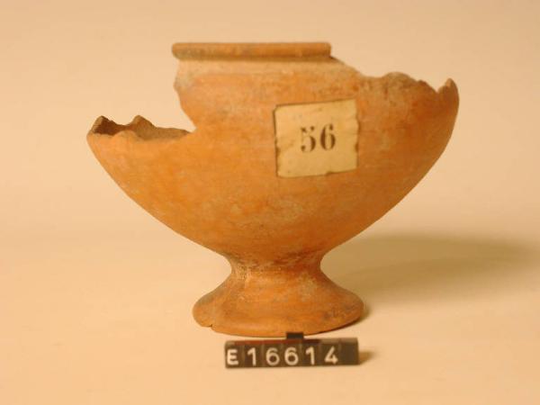 Coppa su medio piede svasato a tromba, orlo a cordoncino, decorata a stralucido rosso a reticolo.