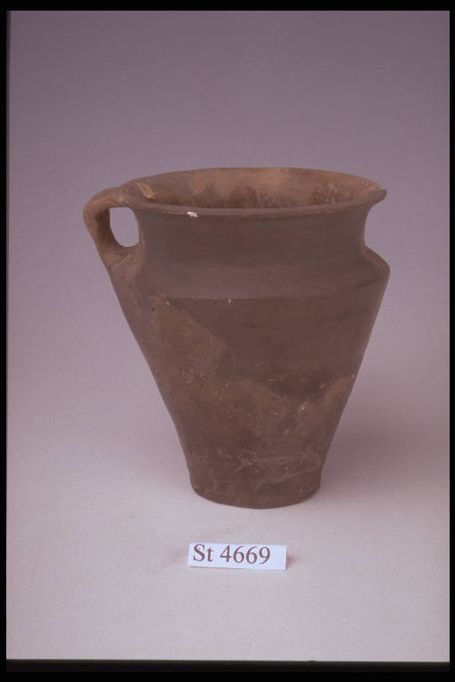 Vaso situliforme con ansa a tre costolonature impostata su orlo e spalla; orlo appena esoverso, collo cilindrico, spalla spigolosa. Colore di superficie nerastro.