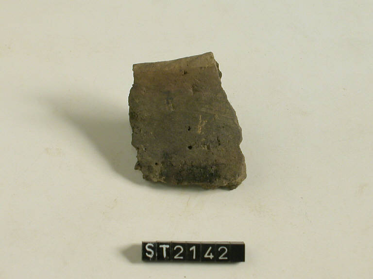 Frammento di orlo di recipiente di forma non riconoscibile. Orlo decorato a tacchette oblique. Colore nerastro.