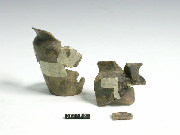 Vaso situliforme con ansa con leggera costolonatura mediana, fondo concavo; tre file di grano di riso impresse sotto l'ansa. Colore nerastro.