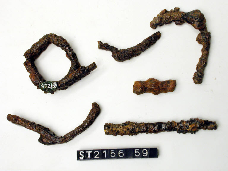 Frammento di verghetta a sezione rettangolare; presenta tre curvature e un'estremità integra appuntita.
