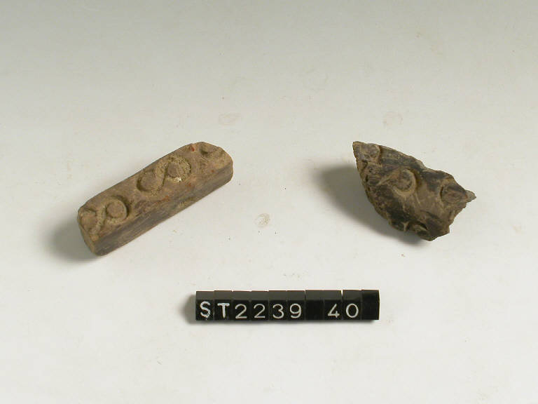 Elemento di raccordo tra i bracci di un candelabro in ceramica, sezione rettangolare, decorato da motvi a stampiglia a S. Colore bruno scuro.