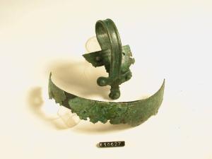 Capeduncola a corpo emisferico, decorato sotto l'orlo a incisione; attacco inferiore dell'ansa a trifoglio.