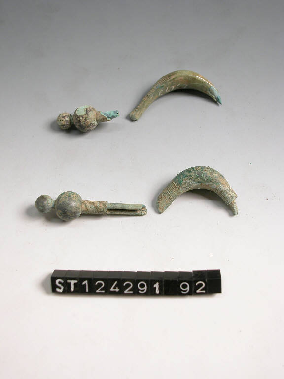 Arco di fibula a sanguisuga di tipo tardo-alpino e frammento di staffa desinente a doppio globetto probabilmente pertinente allo stesso pezzo.\n(vedi annotazioni)