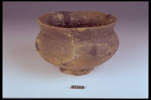 Urna cineraria panciuta con tre solcature lungo il collo. Basso piede troncoconico.