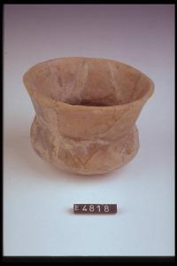 Bicchiere carenato con fondo ombelicato, decorato da tacche ovoidali impresse lungo il diametro massimo.