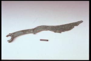 Coltello a lama serpeggiante, dorso ricurvo,lingua da presa fissata mediante ribattini, manico ad anello.