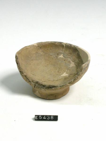 Vasca emisferica su basso piede a profilo obliquo, superficie di colore bruno in prossimità dell'orlo.