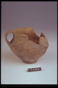 Boccalino a corpo troncoconico con ansa a nastro, spalla arrotondata.