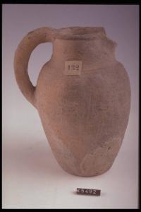 Imboccatura circolare con becco; collo cilindrico, ventre ovoidale; ansa a bastoncello verticale.